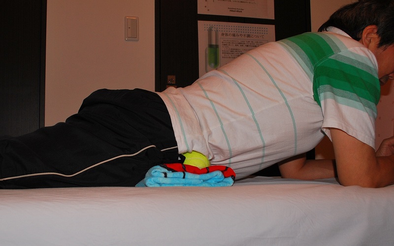 2-4 次いで、肋骨の下の胃の辺りにテニスボールを移動して